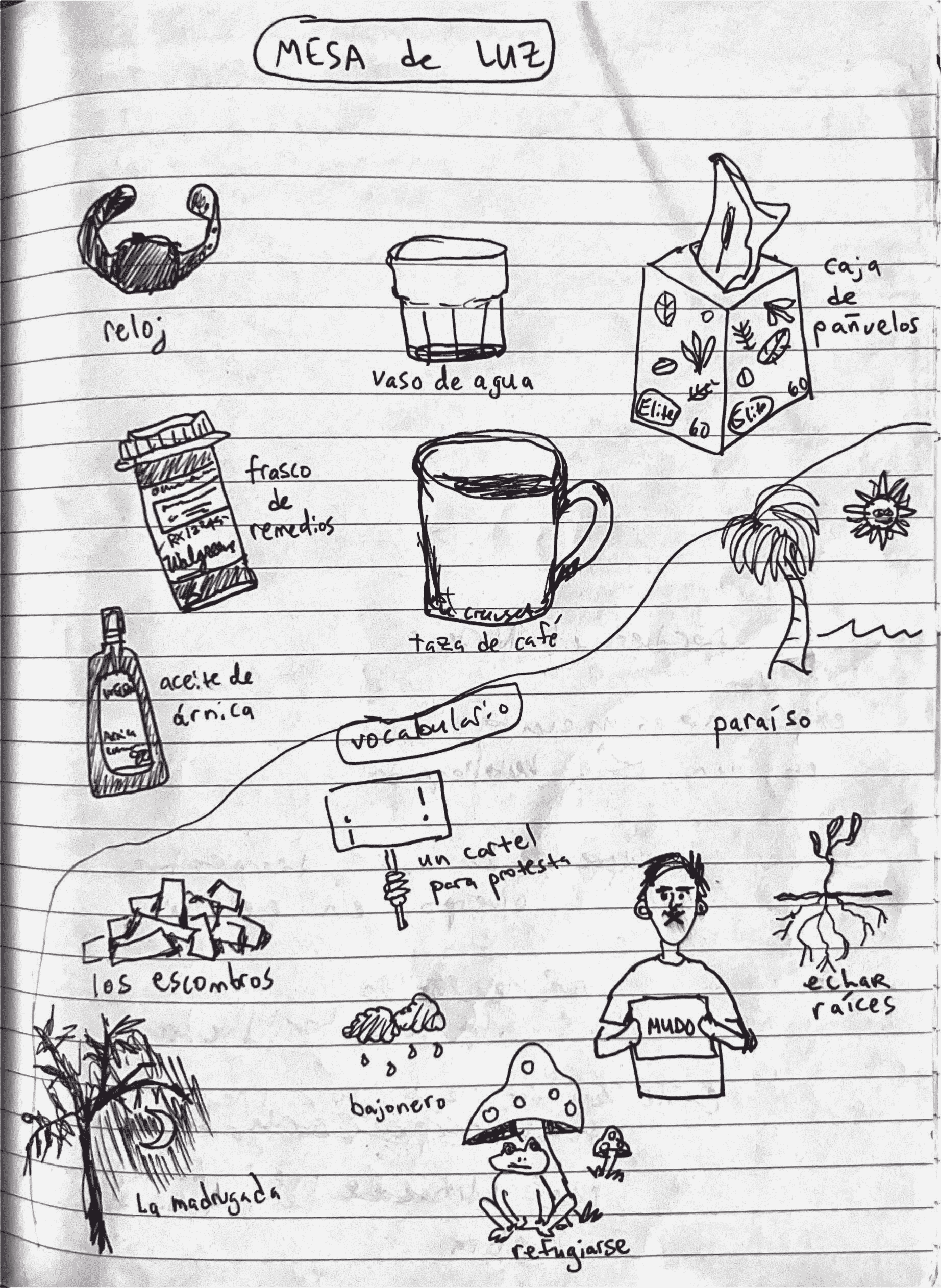 André Aciman once wrote that the “pernicious thing” about exile is the “impossibility of ever not being away.” He noted how small, everyday things become dramatic tokens of dislocation. In the drawing above, I am re-labeling those small things: the watch (reloj), the water (vaso de agua), the medicine (remedios).